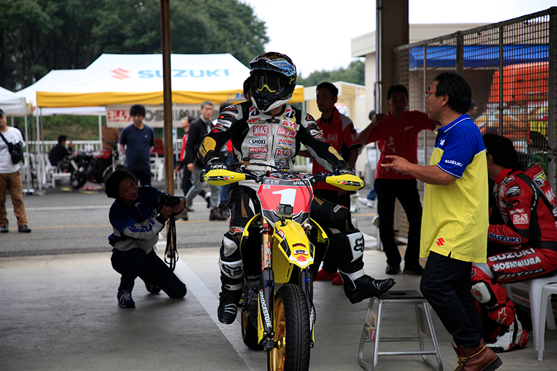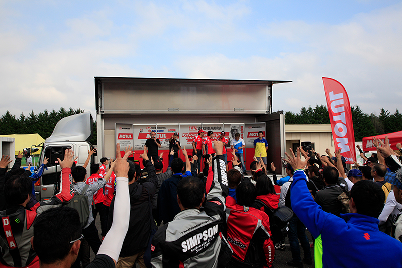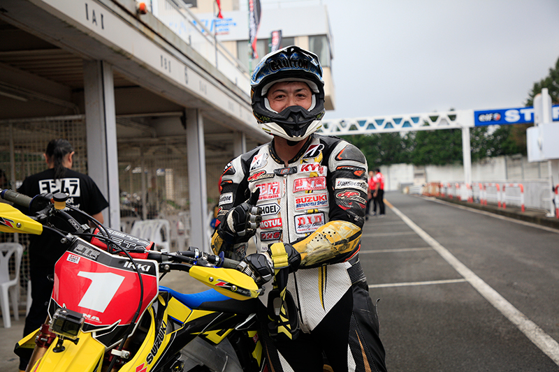 11時半からは、津田選手、渡辺選手、加賀山選手、森田選手によるGSX-R150エキシビションレースを開催。スーパーモトライダーの森田選手もGSX-R150で参加し、一時はトップに浮上。最後まで接戦をとなる迫力のレース展開でしたが、ロードレース勢の巻き返しを受け、津田選手、渡辺選手、加賀山選手、森田選手の順でチェッカーフラグを受けました。