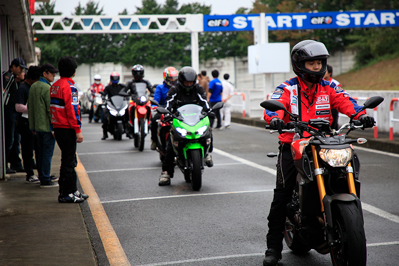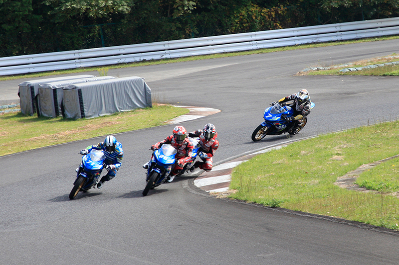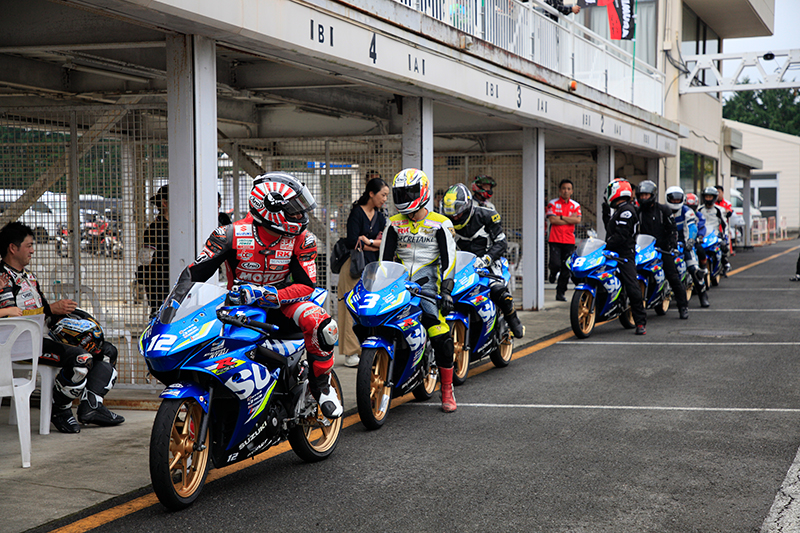次に、津田拓也選手、渡辺一樹選手、加賀山就臣選手、森田一輝選手の先導によるGSX-R150 SACレーサーの試乗会を開催しました。この試乗会では、6周と長めの周回数を設定し、スズキ・アジア・チャレンジで実際に使用されていたレーサーマシンで、プロライダーのライン取りや、ライディングフォームを間近で見ながらサーキット走行をするという貴重な体験をお楽しみいただきました。