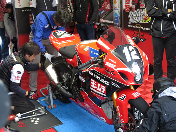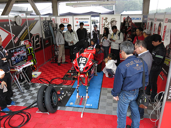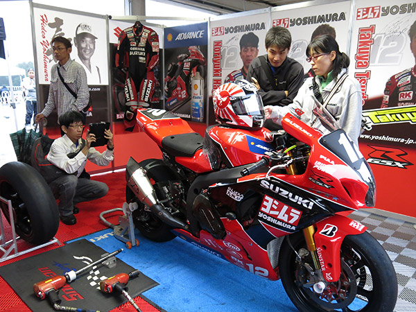そのピット内で、メカニック指導のもと急遽開催されたGSX-R1000レーサー(2016 8耐仕様)作業体験では、実際にお客様にタイヤ交換の作業を行っていただく事で、8耐でもトップクラスの作業スピードを誇るヨシムラのノウハウに触れて頂けたのではないでしょうか。