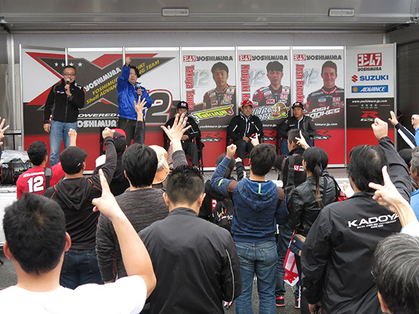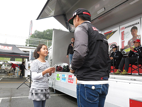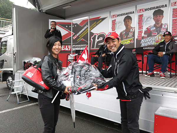 来場いただいたお客様とレーサーを前にして集合写真撮影や、プレゼントジャンケン大会は、ヨシムラグッズや多くの協賛品の他、8耐を戦った選手から提供されたグッズや装具に会場が沸き立ちました。