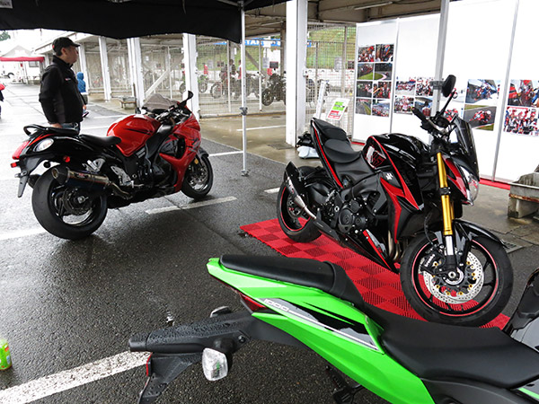 当日はヨシムラパーツ装着マシンの試乗会、ヨシムラ鈴鹿8耐ピットの再現の他、ライダー津田 拓也 選手に8耐マシンのデモランや、隼でのタンデム体験を予定していたのですが、生憎のコンディションで残念ながら中止とさせていただきました。