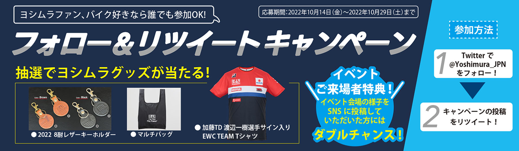 3年ぶりとなるYOSHIMURA MEETING 2022 in NASU MOTOR SPORTS LANDの開催を記念し、フォロー&リツイートキャンペーンを実施します。