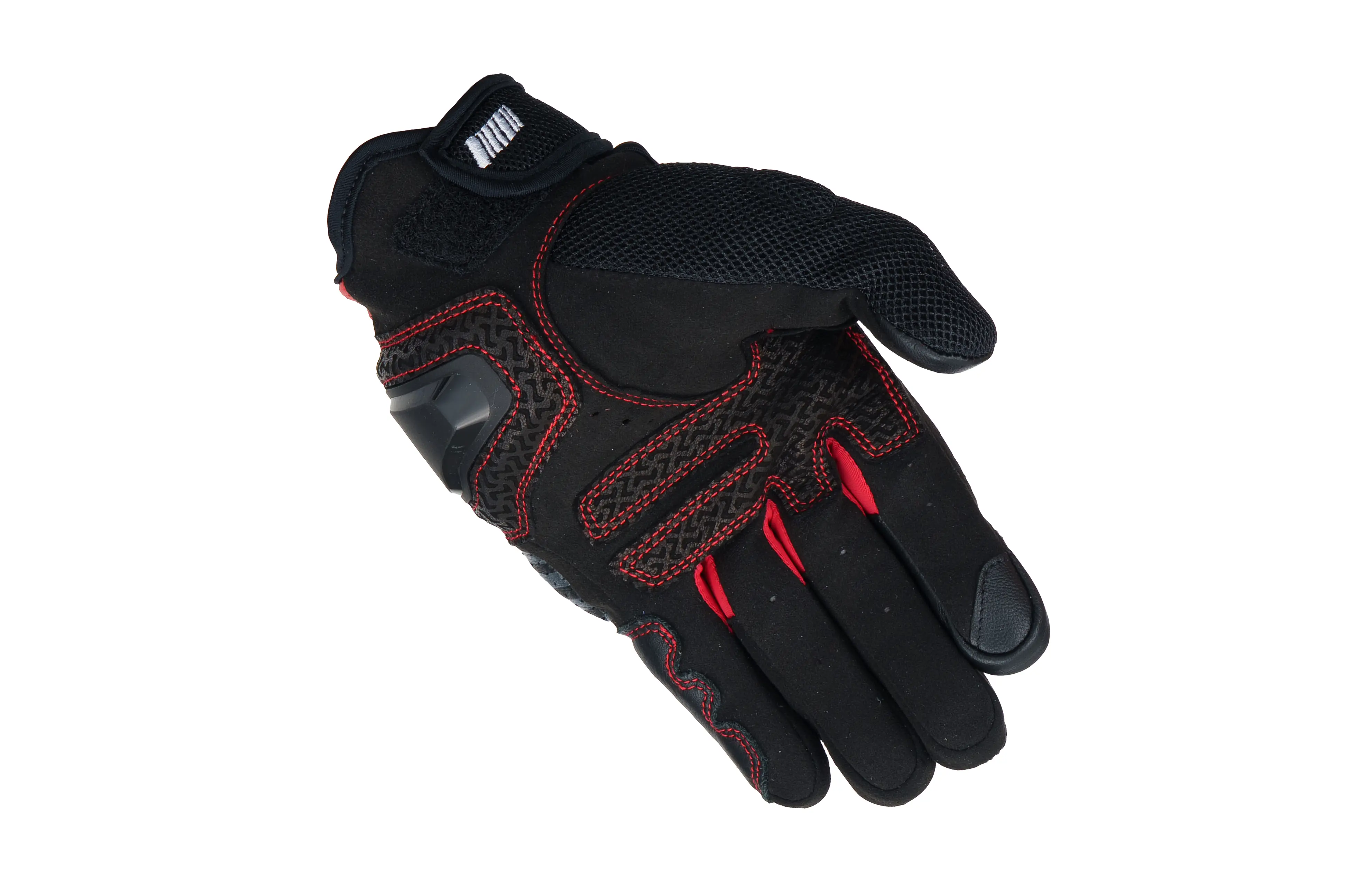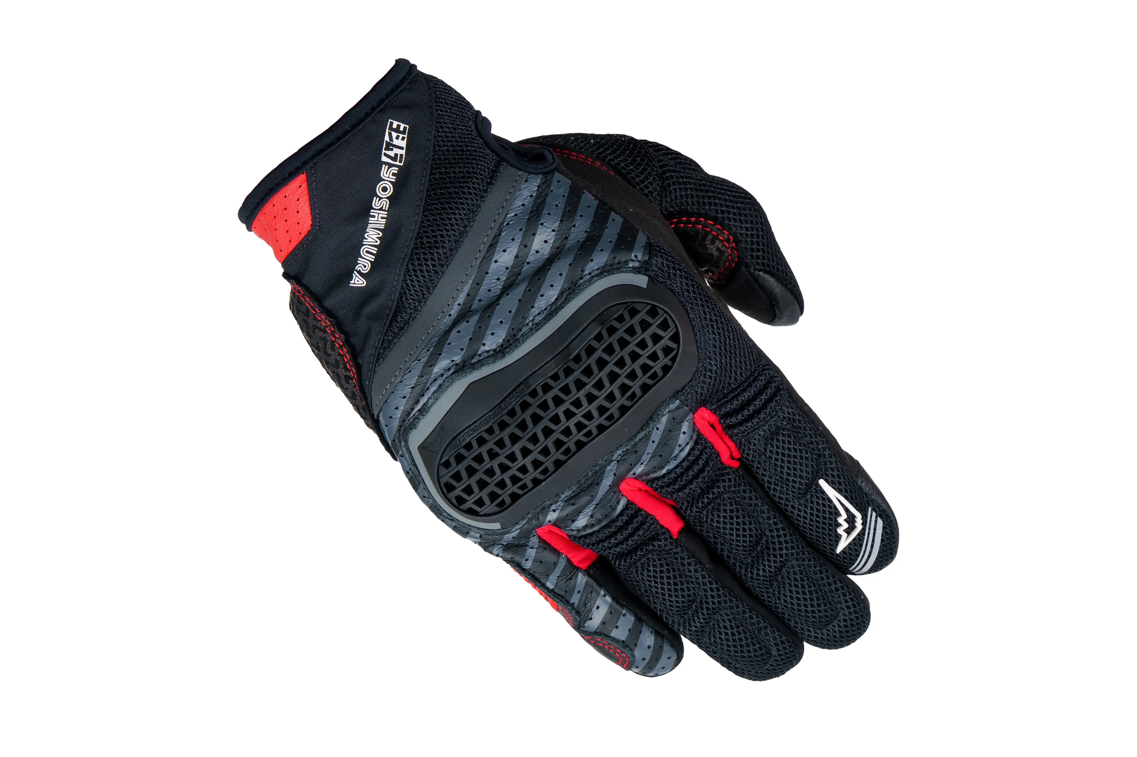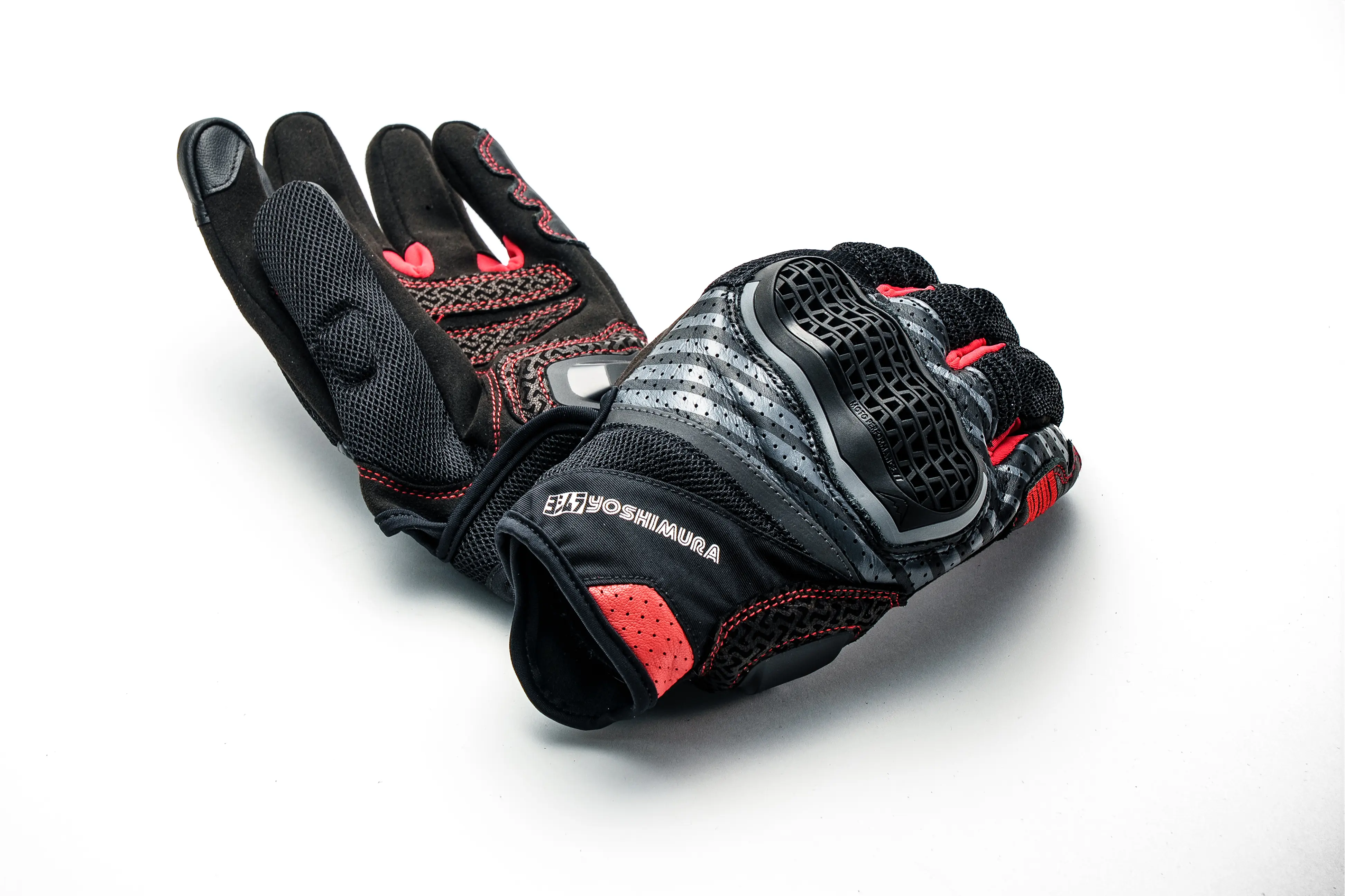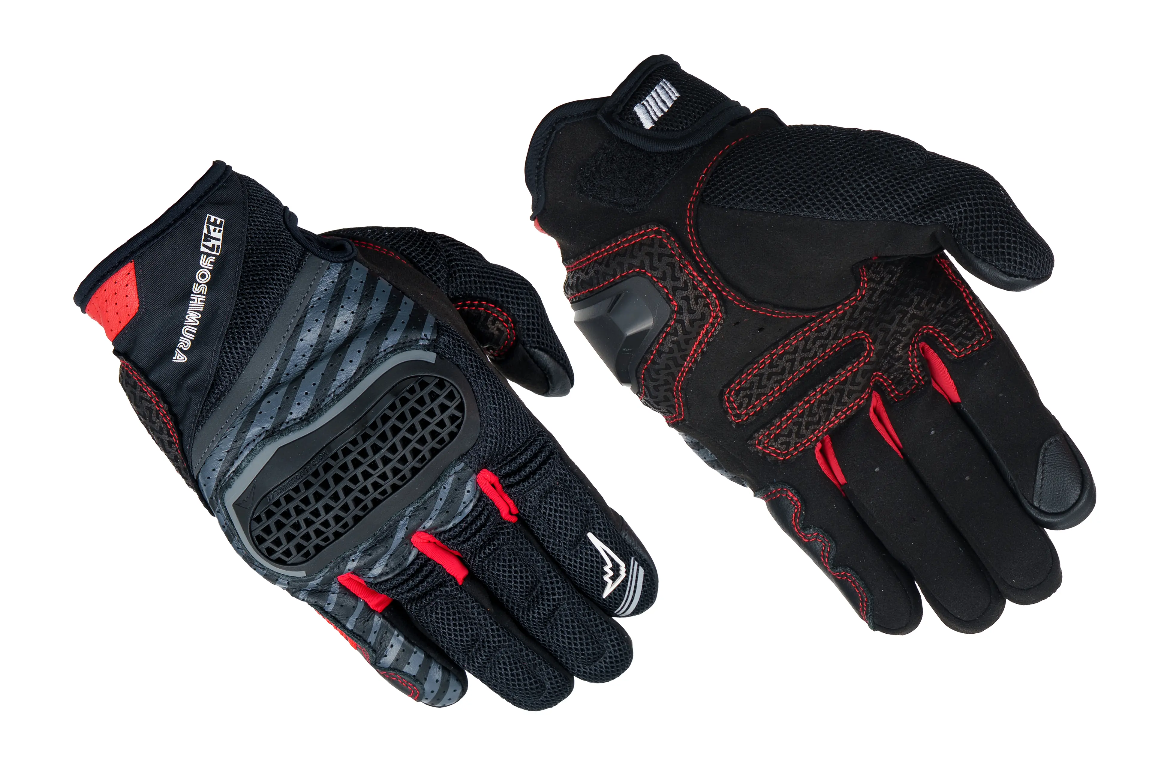 ヨシムラポリエステルメッシュグローブです。フィンガープロテクター、パームプロテクター、リフレクト、スマフォタッチ、フィンガーシャーリングを備えたグローブです。独自開発のベンチレーション機能を備えたナックルプロテクターを装備しています。指マチには2wayニットを採用しより積極的に走行風を取り入れます。