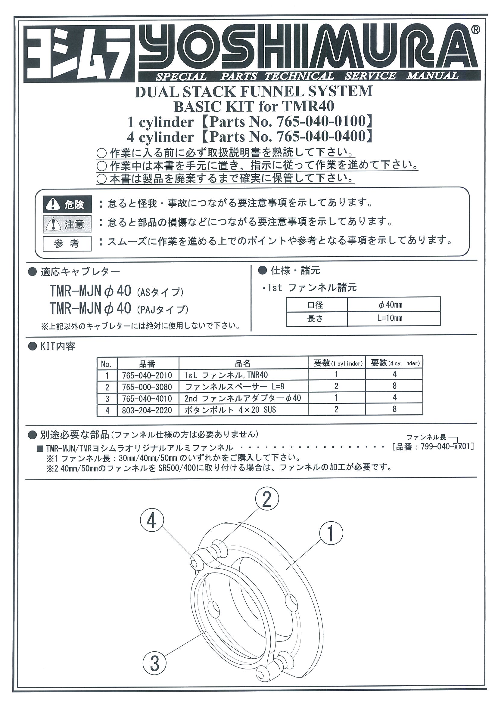 別途TMR-MJN/TMR40用ヨシムラオリジナルアルミファンネルが必要です。(ファンネル仕様の方は別途購入の必要はありません。)構成部品