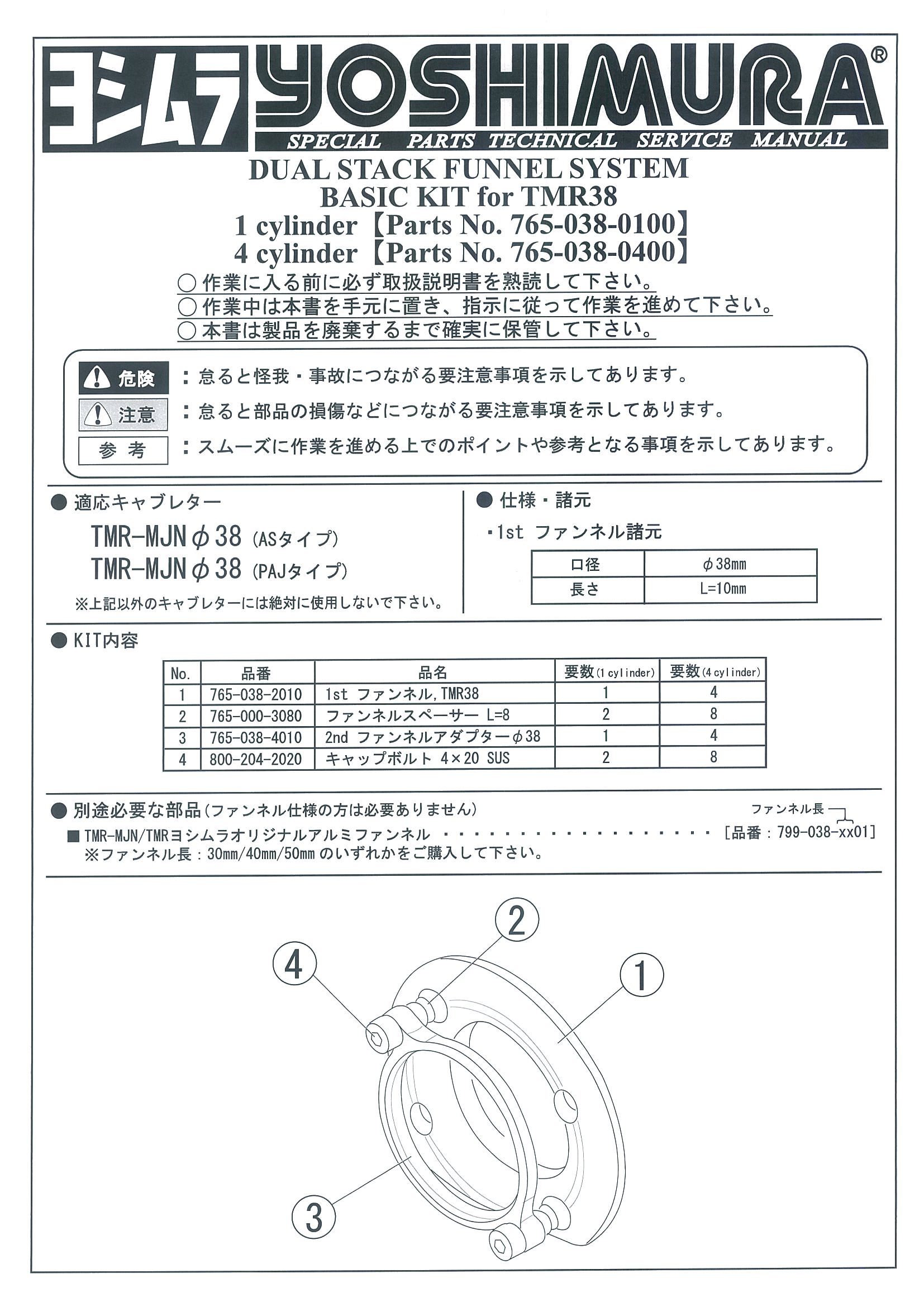 別途TMR-MJN/TMR38用ヨシムラオリジナルアルミファンネルが必要です。(ファンネル仕様の方は別途購入の必要はありません。)構成部品