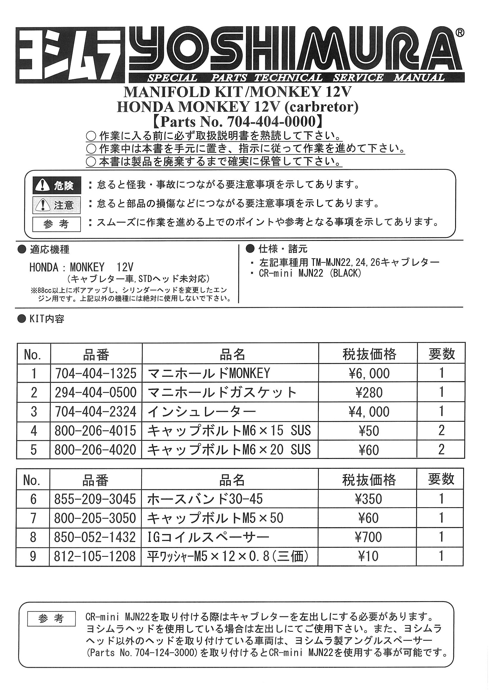 MONKEY に TM-MJN22・24・26 / CR-mini MJN22キャブレターを装着する場合に必要となります。