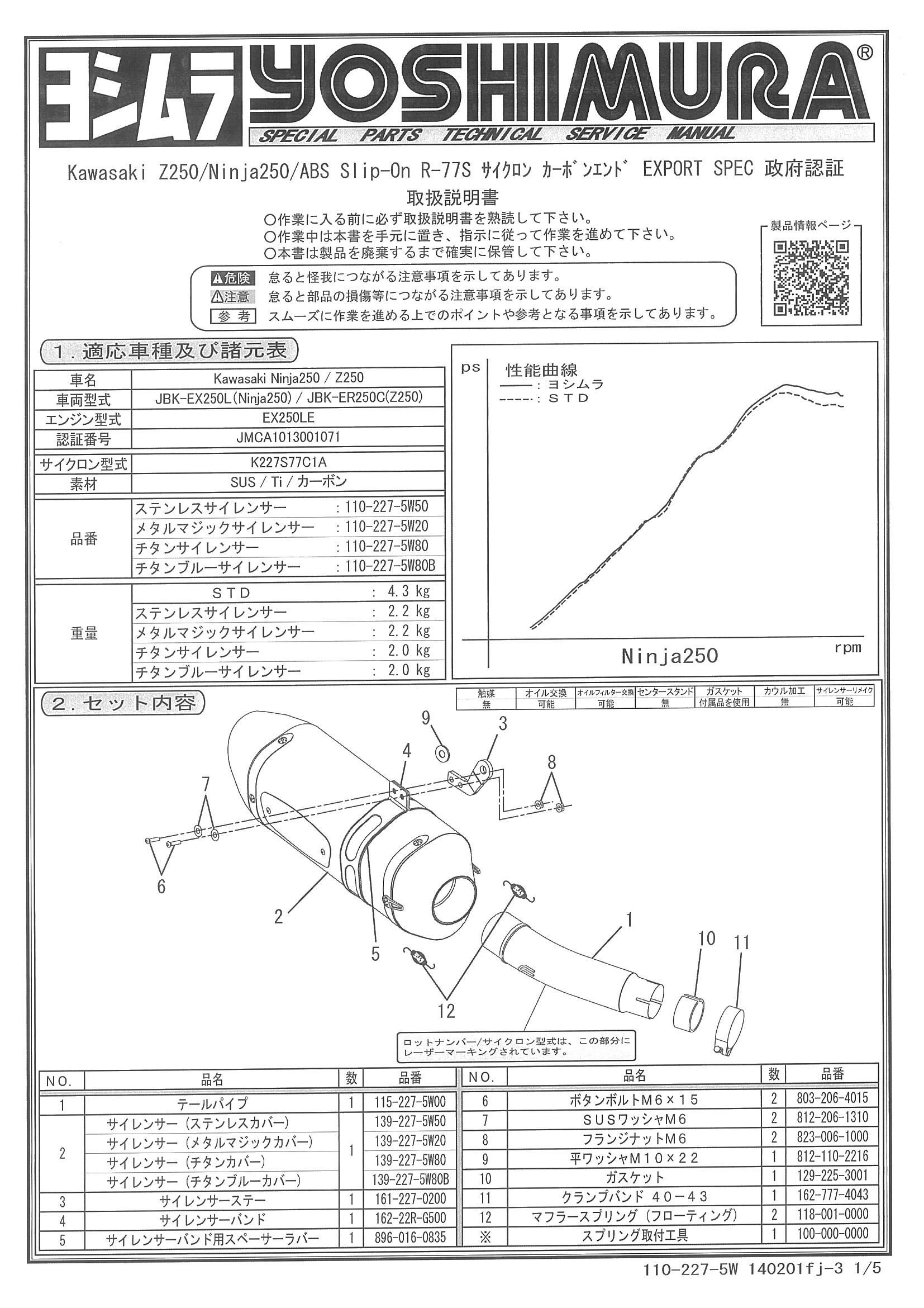 STDマフラーと比べ約53%の軽量化(STD:4.3Kg、R-77S チタンカバー:2.0Kg)に成功。性能面ではストリートで多用する開け始めのトルクが増し、9,500rpm付近より更なるパワーが得られます。R-77Sサイクロンの優れた静音性能によりアイドリング付近はマイルドで、高回転時には迫力のあるサウンドとなります。