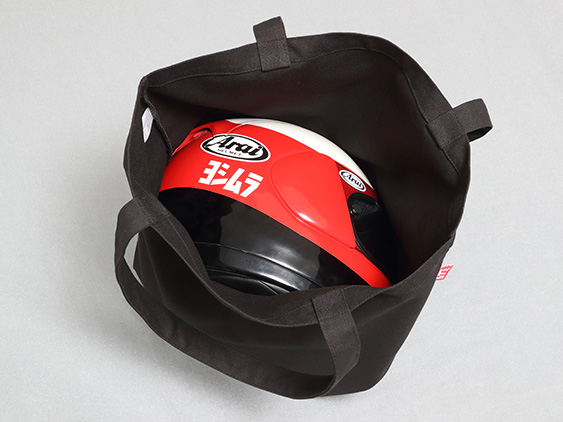 コットン100%、厚手で丈夫な12オンスの平織り生地を使用しています。 船底型のマチを採用し、一般的なサイズのオンロードヘルメットの収納も可能なたっぷりめのサイズです。