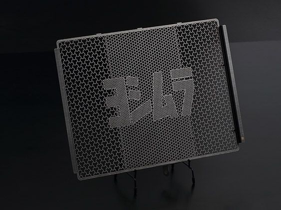 エッチング加工による高精度のhexagonal(ヘキサゴナル=亀甲)メッシュパターンを採用。ヨシムラ独自の「Yライン」を描く美しい網目の中央にはシンプルで主張しすぎない デザインの「ヨシムラ」ロゴを配置。ドレスアップ要素と実用性を備えています。