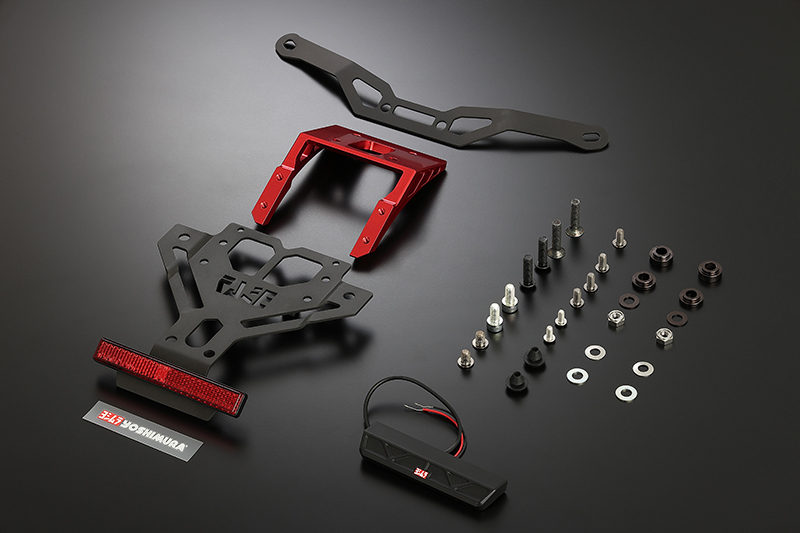 | スパイスの効いたレッドアルマイトのアルミ製ブラケット | [ヨシムラ]に肉抜きされたナンバープレートホルダー |