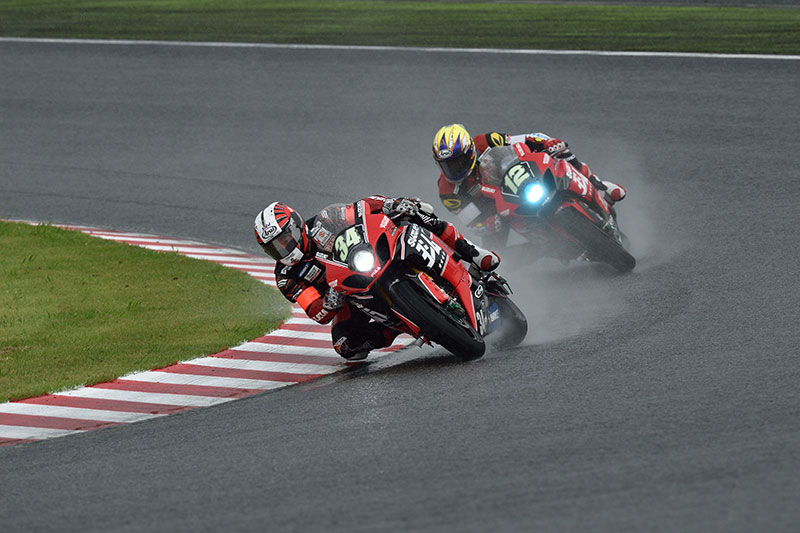 各車レインタイヤ、コースはフルウェットでの決勝レース。スタートはD・エガーター(チームカガヤマ)がホールショットを奪い、B・パークス(モンスターヤマハ)、山口辰也(TOHOホンダ)に続き、#34津田が4番手あたりと、まずまずのスタート。津田はすぐに順位を上げ、S字コーナーでトップに立った山口に続き、2番手に浮上。しかし、シケインで秋吉耕佑(TSRホンダ)にかわされ、3番手でオープニングラップを終了。#12のスタートライダー青木も、10番グリッドスタートから津田の後方に迫り、5番手で2周目へ。青木はそのままパークスをかわして4番手に上がると、3番手を走る津田にみるみる迫り、5周目には背後につけてパッシングのチャンスをうかがう展開に。