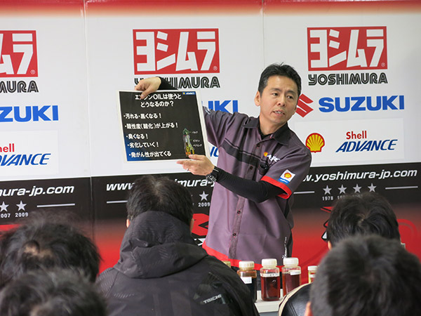 今回は春のツーリングシーズン到来に合わせて、ヨシムラジャパンがレースでお世話になっているメーカー様を講師としてお招きし、それぞれ商品のメンテナンス方法等をアドバイスしながらベストコンディションでシーズンを迎えられるように講習会を開催しました。