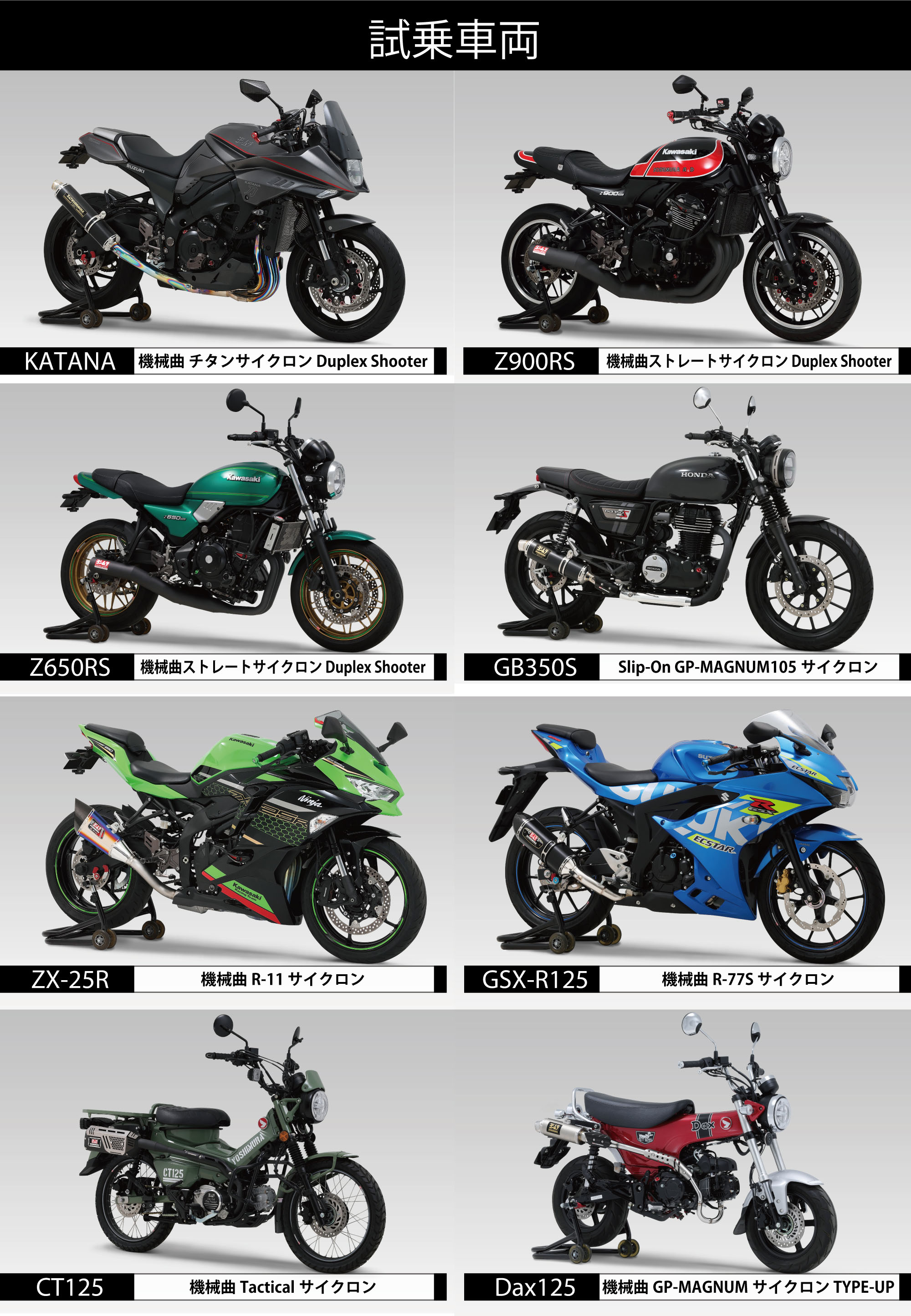ヨシムラマフラーをはじめ、様々なヨシムラパーツを装着した車両を試乗いただけます。