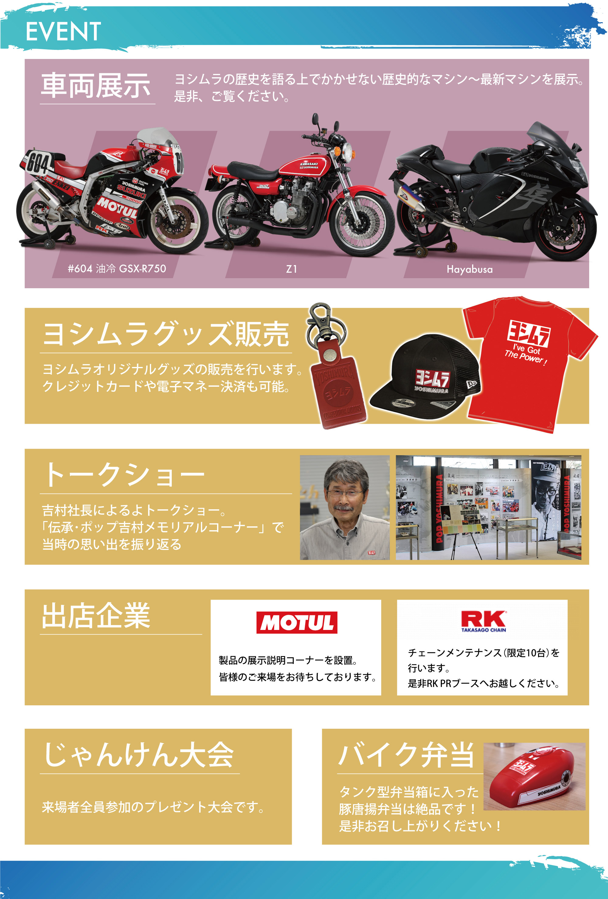 初心者からベテランライダーまで、ご来場者に『ヨシムラ』を楽しんでいただけるイベントです。