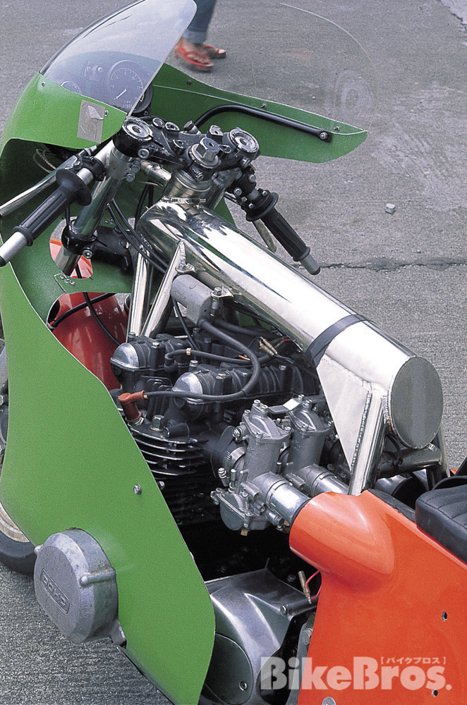 Yoshimura-powered Egli Kawasaki Z2 raced in Japan by Shohei Kato (circa 1976). Yoshimura acquired the Egli frame when the prominent Swiss frame builder asked Yoshimura to barter his frame for Yoshimura Z1 engine. The frame was then fitted with a 69mm-bore 867cc Z2 engine which Fujio built in Japan (before he returned to the States in November 1976 with a new visa) along with a set of race-proven Morris mag wheels which he imported from the States. The bike took pole and 2nd place in a MCFAJ (Motorcycle Club Federation of All Japan) race held at Fuji Speedway with a top speed as fast as the fastest 2-stroke production racers at the time such as Yamaha TZ750, TZ350 and Suzuki RG500.